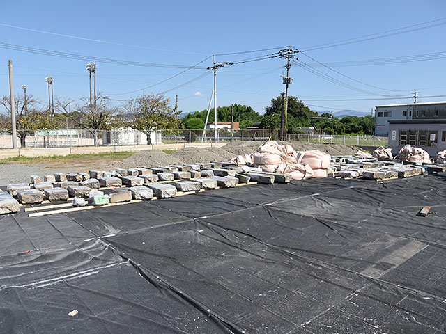 外部ヤードへの階段石搬出状況。