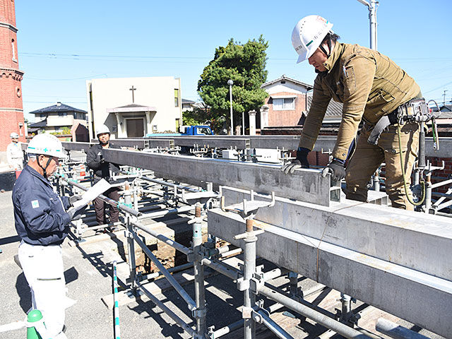 削孔・地盤改良用機械を据えるための架台の設置を行った。
